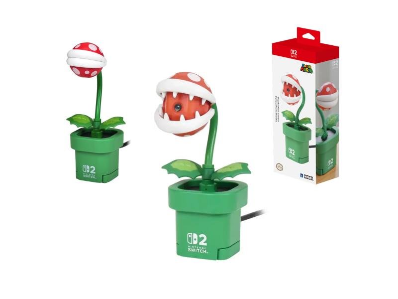Cámara Hori Piranha Plant para Switch 2: resolución 480p, cuello flexible, privacidad y modo base/montaje. ¡Divertida y funcional!