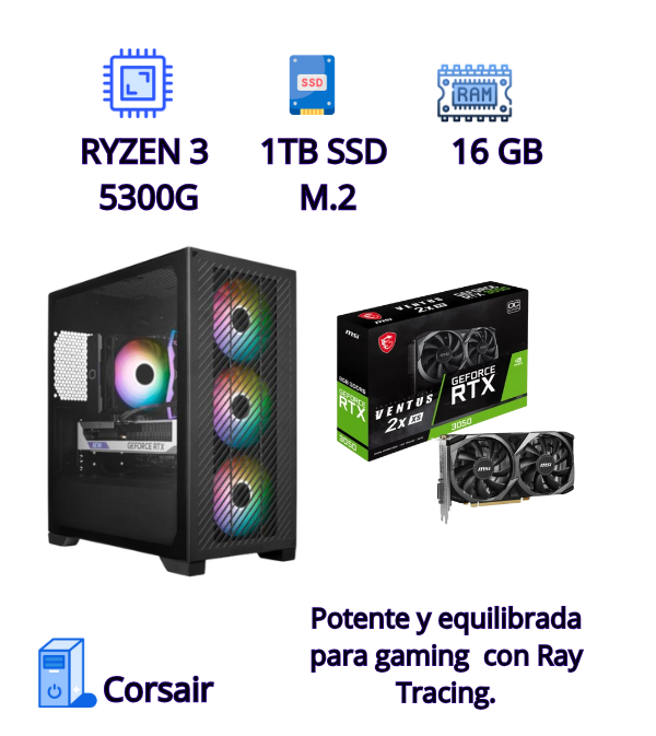 Si buscas una PC gaming con excelente rendimiento en juegos AAA y competitivos, la PC Gaming Storm RTX 3050 es tu mejor opción. Diseñada con componentes de última generación, este equipo ofrece la potencia del AMD Ryzen 5 5300G, el rendimiento gráfico de la RTX 3050 y la velocidad de un SSD NVMe de 1TB, brindando una experiencia fluida y sin interrupciones.