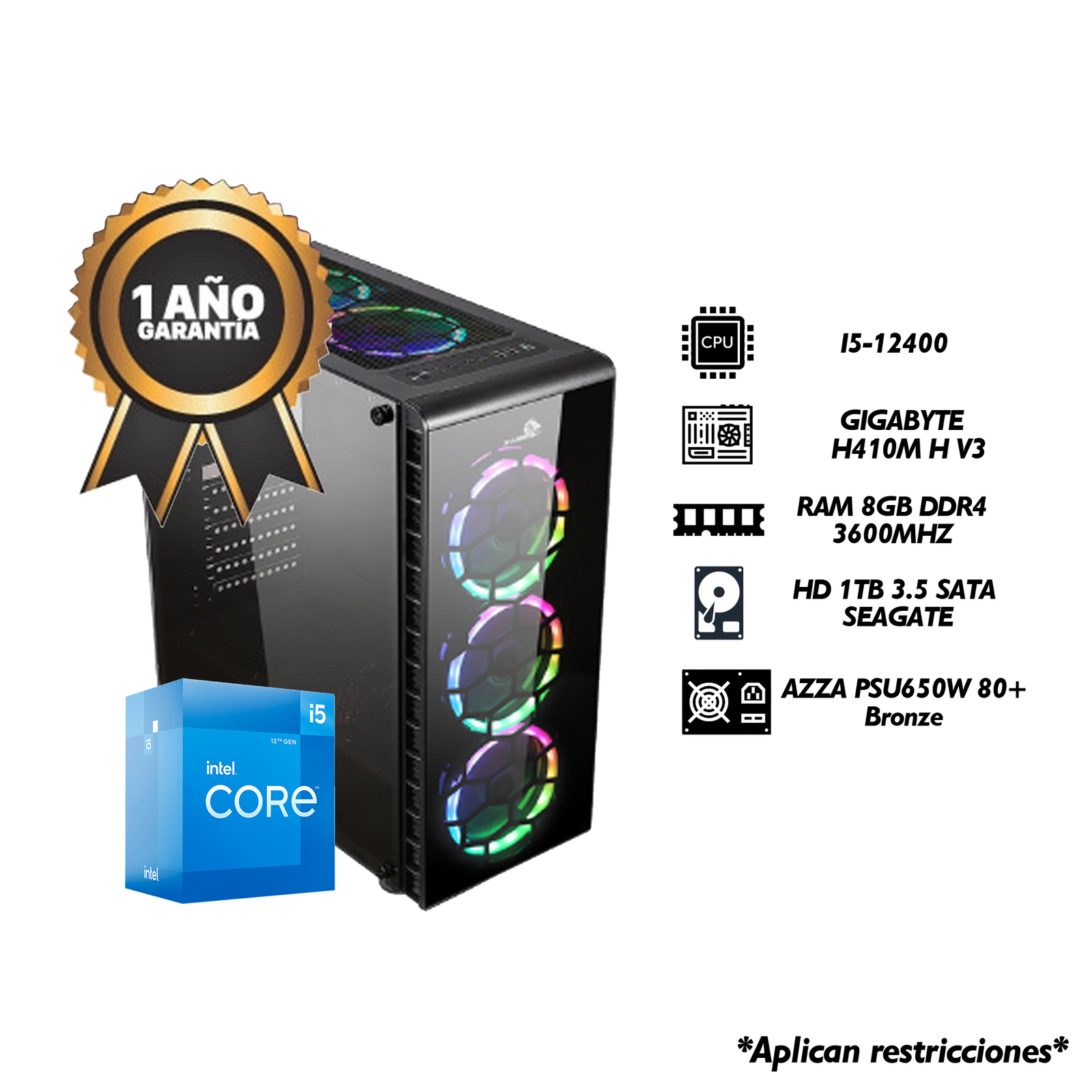 La computadora gaming Asteroth de ARCADIA es una potente máquina diseñada para ofrecer un rendimiento superior. El procesador Intel Core i5 10400 ofrece un rendimiento excepcional, mientras que la tarjeta madre GIGABYTE H410M H V3 ofrece un soporte sólido y confiable. La computadora viene con 8GB de memoria DDR4 a 3600MHz, lo que le permite ejecutar juegos y aplicaciones de forma rápida y eficiente. La fuente de poder AZZA PSU650W 80+ Bronze ofrece una alimentación fiable y estable, mientras que el case gamer X–LION KN–835 ofrece una apariencia impresionante. La computadora viene con 1TB de espacio de almacenamiento interno, lo que le permite almacenar todos sus juegos, aplicaciones y datos.