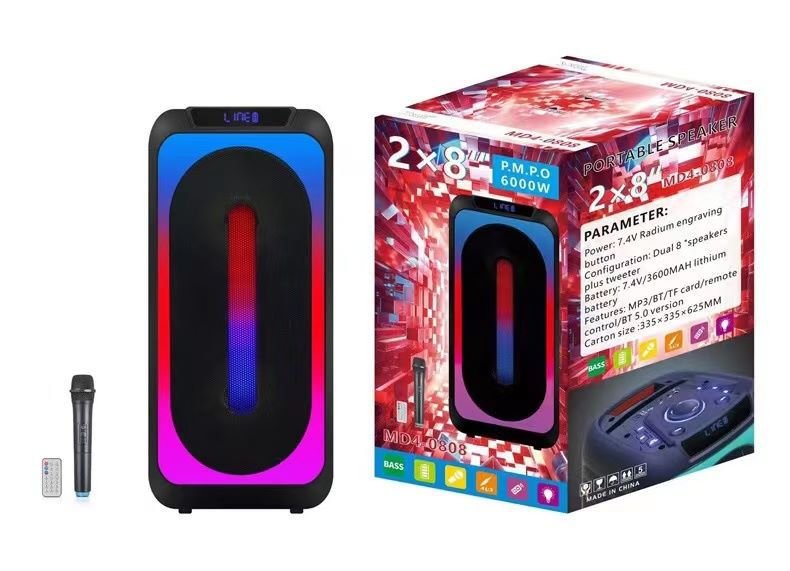 Parlante tipo torre en formato maleta MD4-0808 equipado con woofer de 8 pulgadas. Diseño portátil con ruedas y asa retráctil que facilita su transporte a eventos, fiestas y reuniones al aire libre o en interiores. El modelo Q18341 ofrece un sistema de audio versátil ideal para entretenimiento musical y karaoke. Su construcción tipo maleta protege los componentes durante el traslado y permite posicionarlo verticalmente para una mejor proyección del sonido. Compatible con diversos dispositivos de reproducción musical. Perfecto para celebraciones familiares, eventos deportivos o uso residencial en Costa Rica. Verifique las especificaciones técnicas completas de conectividad, potencia y accesorios incluidos según datos oficiales del fabricante.
