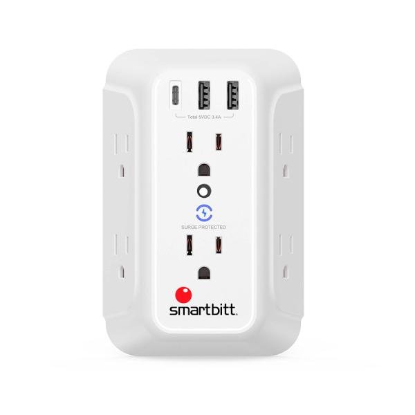 Protege tus dispositivos con el supresor de picos SURGE SMARTBITT: 6 tomas AC, 3 USB para carga rápida y diseño compacto. Seguridad y eficiencia en uno.